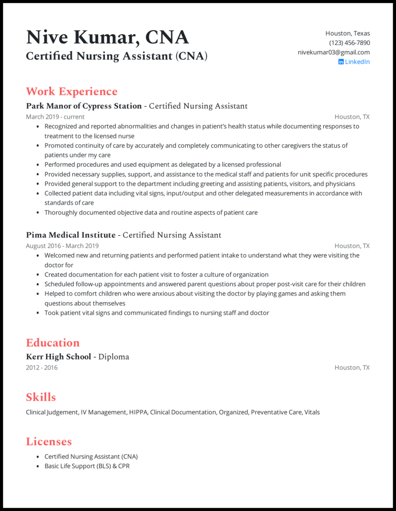 The functional resume is the best resume format because it can be flexible enough to fit any type of experience you have. Part four choose a nurse resume format. To prepare for your role as a certified nursing assistant, you attended a certified nursing assistant training program. Cnas can work in a variety of settings, including hospitals, clinics, nursing/assisted living homes, and even in client homes. Now that we've discussed each piece of the nursing graduate resume, let's put it all together in this example resume using a simple format, nancy a.